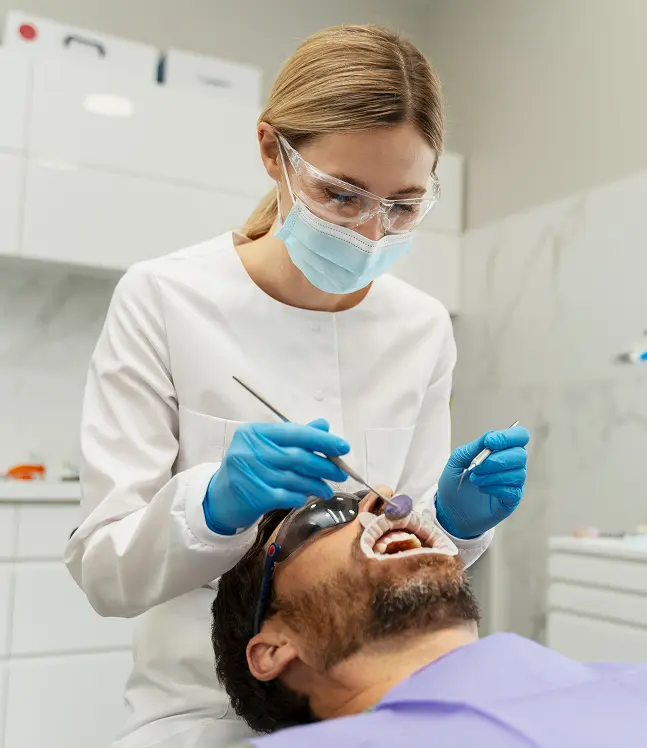 Nākamajā solī zobārsts uzklāj speciālu adhezīvu sistēmu, kas darbojas kā saistviela starp dabīgo zobu un kompozītmateriālu. Šī saistviela tiek aktivizēta ar speciālu zilās ultravioletās gaismas lampu, radot izturīgu ķīmisko saiti.